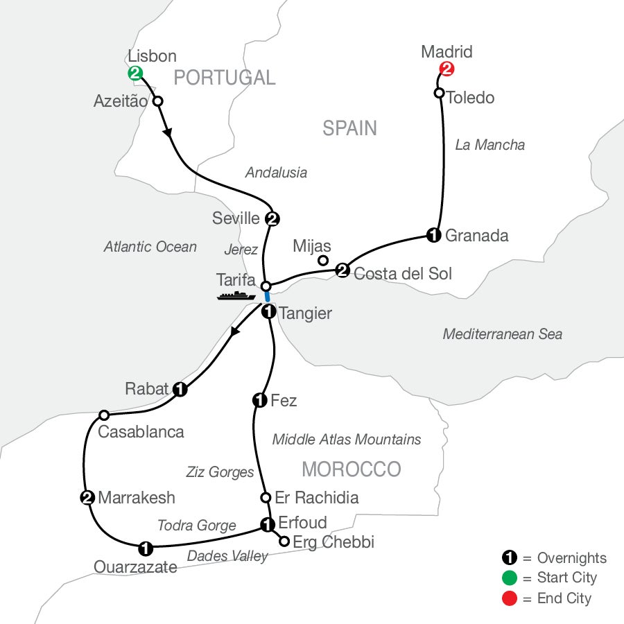 TOUR HIGHLIGHTS: Lisbon, Azeitão, Seville, Tangier, Rabat, Casablanca, Marrakesh, Ouarzazate, Erfoud, Erg Chebbi, Er Rachidia, Fez, Mija, Costa del Sol, Granada, Toledo, Madrid